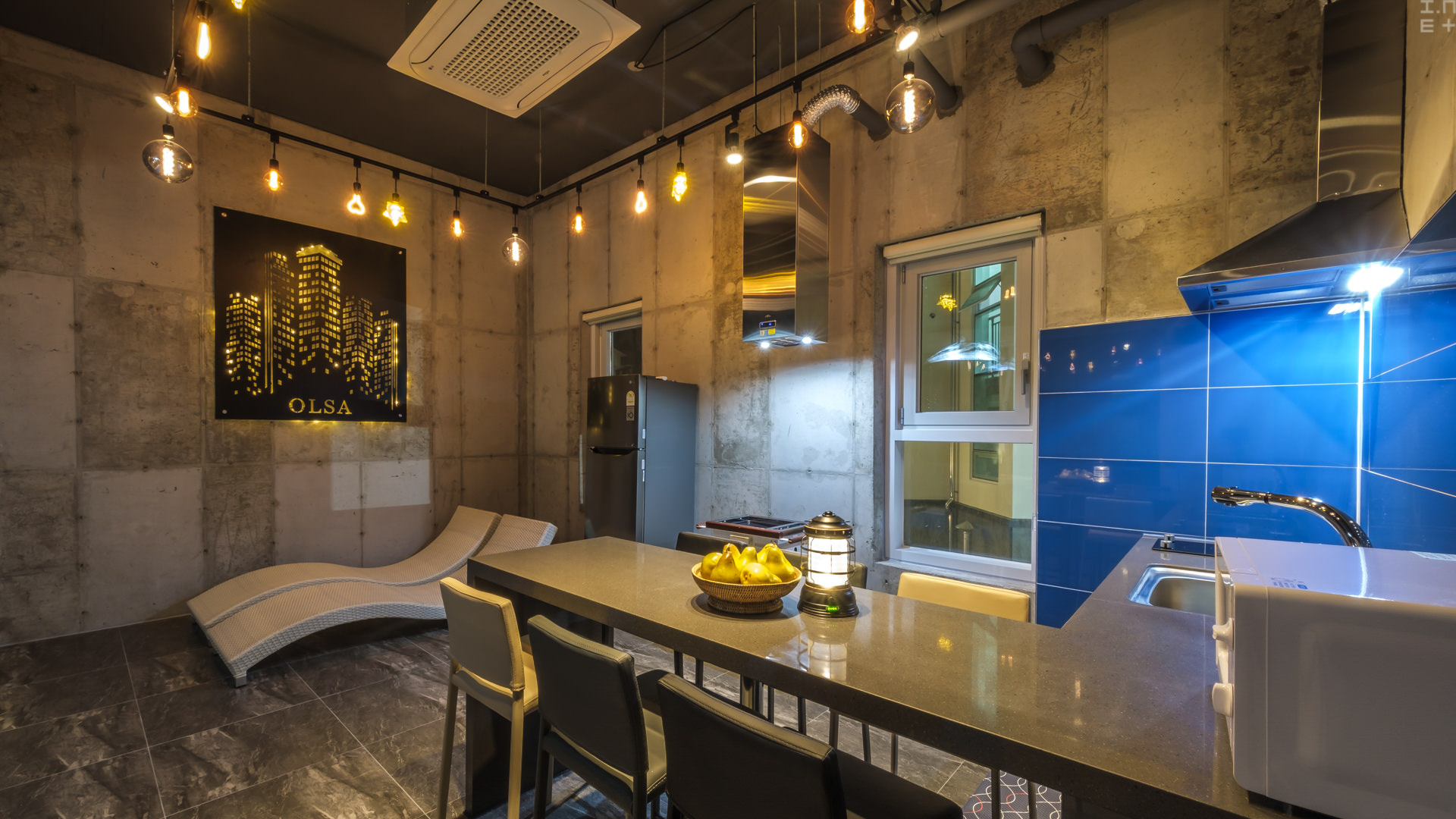 - TV, 침대, 화장대, 소파, 에어컨, 냉장고, 아일랜드식탁, 전자렌지, 커피포트, 밥솥, 식기류일체, 집기류일체, 와이파이, 화장실2, 원적외선바비큐그릴